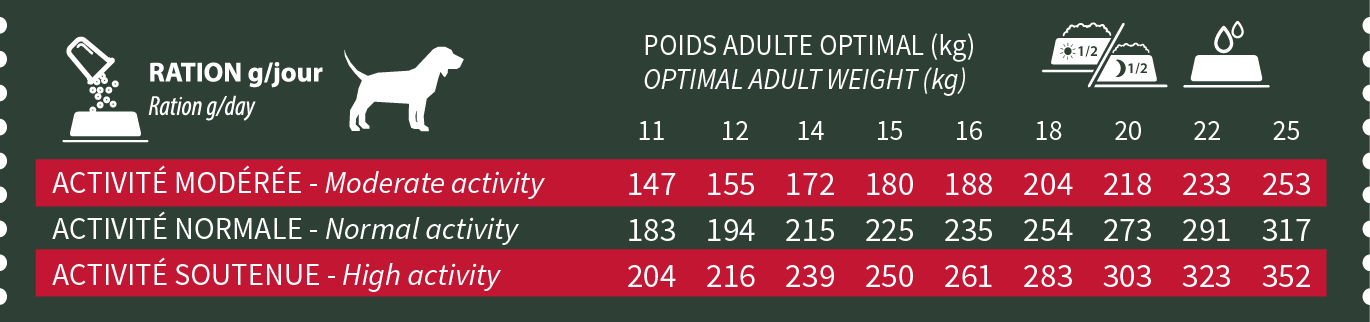 Mode d’emploi : voir tableau de rationnement. Distribuer à sec en laissant de l'eau fraîche à disposition. Les rations journalières sont à titre indicatif et doivent être adaptées aux besoins de votre chien. Si vous changez d'aliment, effectuez une transisiton progressive de 7 jours. Conserver dans un endroit frais et sec, à l'abri du soleil. Refermer le sac après utilisation.