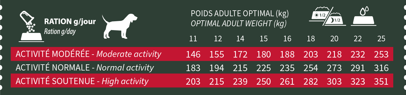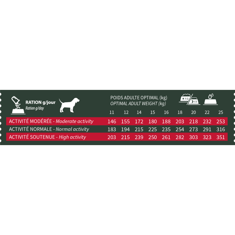Mode d’emploi : voir tableau de rationnement. Distribuer à sec en laissant de l'eau fraîche à disposition. Les rations journalières sont à titre indicatif et doivent être adaptées aux besoins de votre chien. Si vous changez d'aliment, effectuez une transisiton progressive de 7 jours. Conserver dans un endroit frais et sec, à l'abri du soleil. Refermer le sac après utilisation.