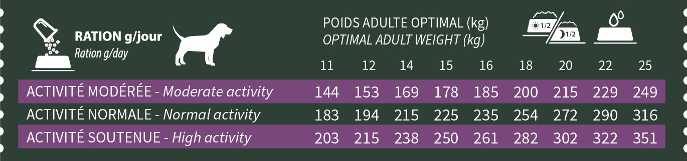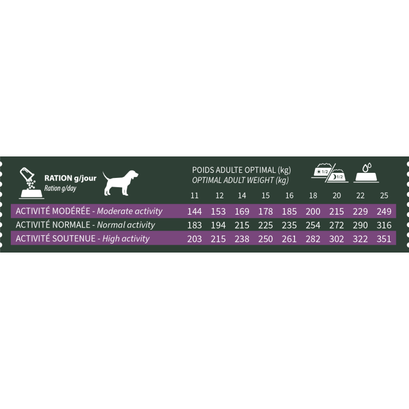 Mode d’emploi : voir tableau de rationnement. Distribuer à sec en laissant de l'eau fraîche à disposition. Les rations journalières sont à titre indicatif et doivent être adaptées aux besoins de votre chien. Si vous changez d'aliment, effectuez une transition progressive de 7 jours. Conserver dans un endroit frais et sec, à l'abri du soleil. Refermer le sac après utilisation.